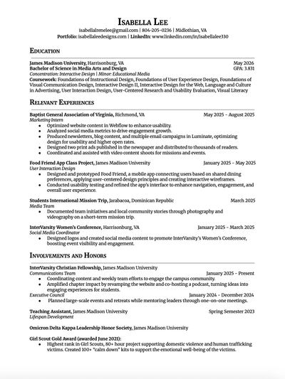 Relevant coursework: Foundations of Visual Communication Design, Audio Visual Storytelling, Foundations of User Experience Design, Culture by Design, Interactive Design for the Web, 308 Advanced Interactive Design, User Interaction Design, User-Centered Research and Usability Evaluation, Business Management in Interactive Design, Law of Media Arts and Design, Language and Culture in Advertising, Instructional Technology, Visual Literacy, Digital Media for Learning, Foundations of Instructional Design.